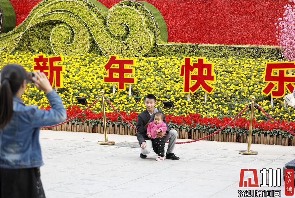 深圳北站東廣場,一位家長和孩子在“新年快樂”的牌子前合影留念。