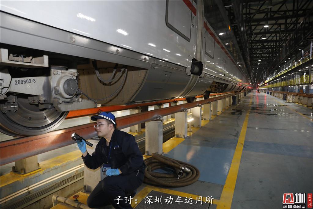 子時:凌晨0點(diǎn)26分,深圳動車運(yùn)用所檢修車間內(nèi),動車地勤機(jī)械師陳愷正在給“下班”的動車檢修。據(jù)了解,深圳動車所的員工有600多人,平均年齡只有25歲,每年春節(jié),他們都要在動車所里度過。