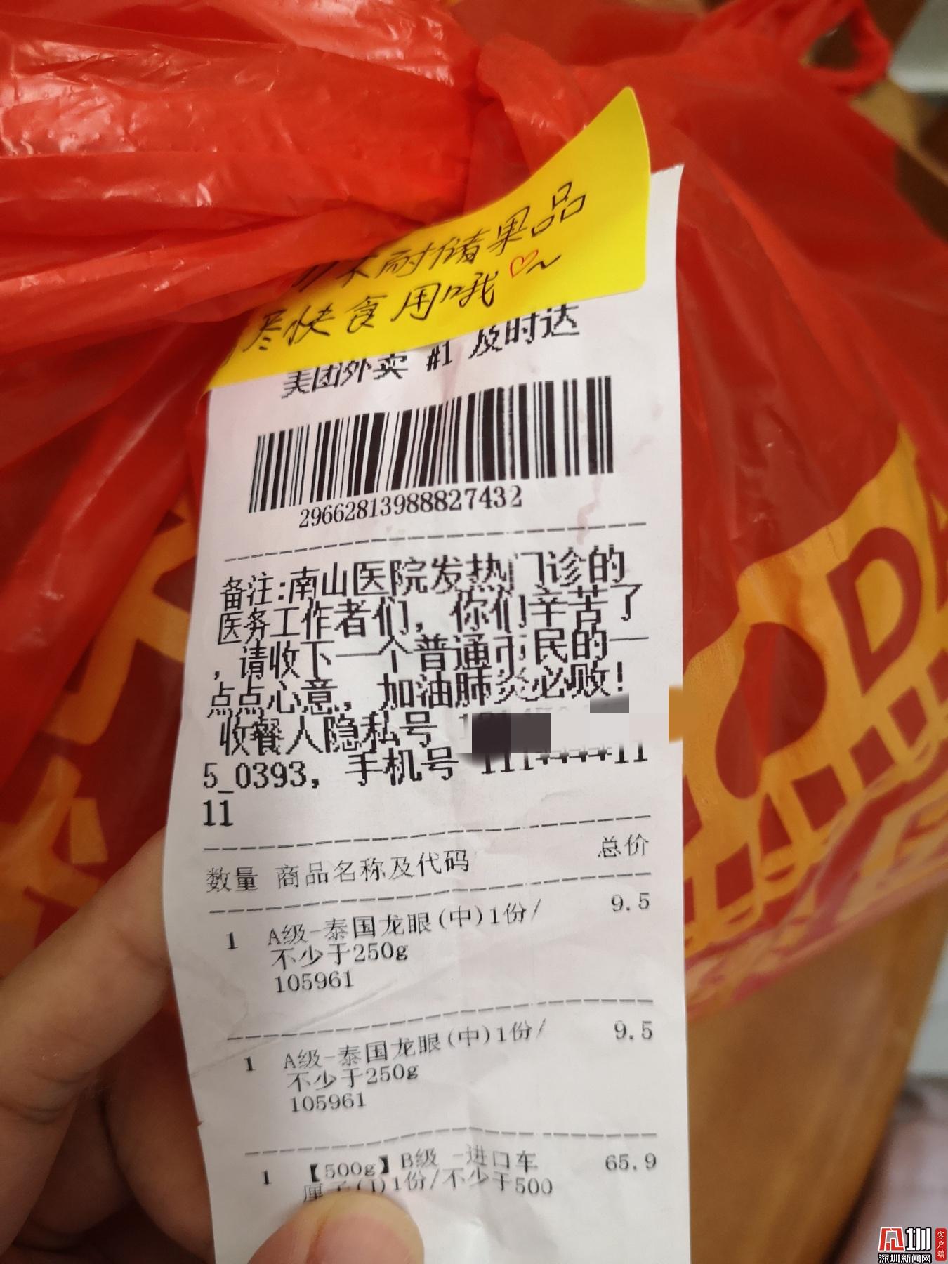 見(jiàn)圳客戶端·深圳新聞網(wǎng)2020年2月1日訊 (見(jiàn)圳客戶端、深圳新聞網(wǎng)記者 劉夢(mèng)婷 通訊員 深協(xié)和)“老淚縱橫!”1月30日晚上8點(diǎn)56分,華中科技大學(xué)協(xié)和深圳醫(yī)院(南山醫(yī)院)手外科護(hù)士王敏在朋友圈曬了一張照片,瞬時(shí)網(wǎng)友們紛紛點(diǎn)贊。照片里是一個(gè)紅色塑料袋上貼著一張外賣(mài)單,備注上寫(xiě)著,“南山醫(yī)院發(fā)熱門(mén)診的醫(yī)務(wù)工作者們,你們辛苦了!請(qǐng)收下一個(gè)普通市民的一點(diǎn)點(diǎn)心意,加油,肺炎必?cái)。 ?/p>