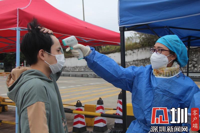 醫(yī)護(hù)人員正給一名體溫異常的乘客測量體溫。