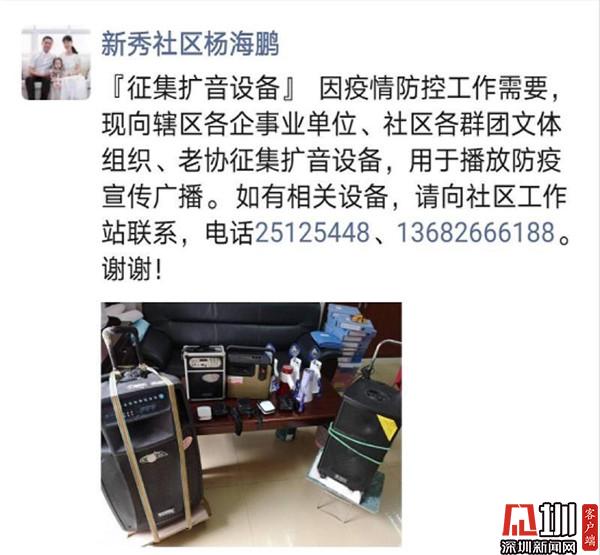 疫情面前,小廣播能發(fā)揮大作用,方便大力宣傳防疫知識。疫情在不斷蔓延,廣播宣傳任務(wù)任務(wù)緊急,而其中新秀社區(qū)一時沒有足夠的擴(kuò)音設(shè)備,于是,立即向居民、社會團(tuán)體、企業(yè)等發(fā)出征集令。新秀社區(qū)黨委書記楊海鵬在微信朋友圈發(fā)布了征集信息及聯(lián)系電話。沒想到這征集令一發(fā)出,很快就得到了市民朋友的積極響應(yīng)。