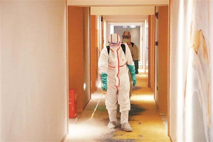 ▲消殺人員對(duì)酒店走廊進(jìn)行消殺。