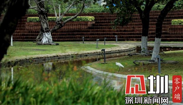 海濱廣場(chǎng),一只白鷺棲息在無(wú)人的草地上悠閑的踱步。