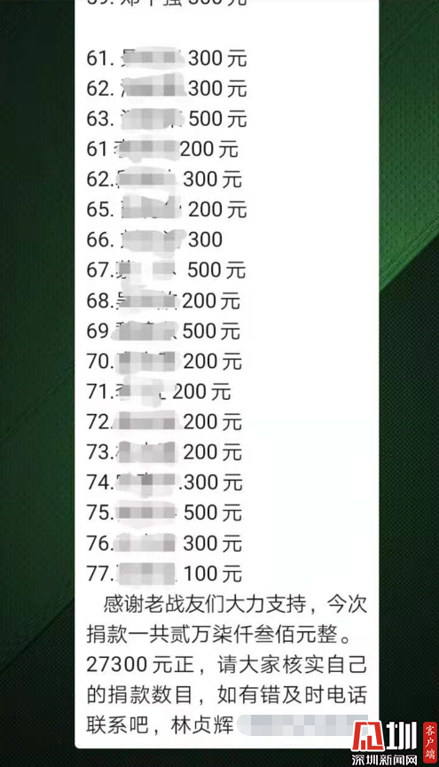 “各位戰(zhàn)友,現(xiàn)在疫情形勢如此嚴(yán)峻,正是需要我們排憂解難的時候,我們不能袖手旁觀,現(xiàn)向戰(zhàn)友們發(fā)起防護(hù)口罩捐助倡議……”早在2月2日,林貞輝便在翠竹街道退役軍人微信群里發(fā)起捐款倡議。捐款的倡議一發(fā)出,便得到熱烈響應(yīng),退役軍人們紛紛在群里接龍捐款:200元、300元、500元……微信群里的捐款數(shù)字不斷累加,不到一天的時間,便籌集到來自76位退役軍人的愛心善款27300元。