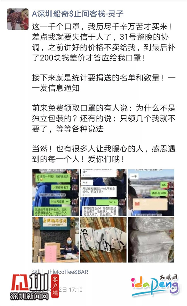 口罩作為最重要的防護物資之一,在這場疫情防控戰(zhàn)打響后需求量迅速增加,市面上的口罩供不應(yīng)求。大鵬新區(qū)女性創(chuàng)客示范民宿止間客棧老板黃靈芝在這樣的困局中仍想出份力,于是輾轉(zhuǎn)聯(lián)系上了在尼泊爾的朋友,從1月29日到31日,連續(xù)3天反復(fù)溝通協(xié)調(diào),終于買到了1000個口罩,免費贈送給市民以解燃眉之急。過程千辛萬苦,結(jié)果暖人暖心,她在朋友圈寫到:感恩遇到的每一個人。