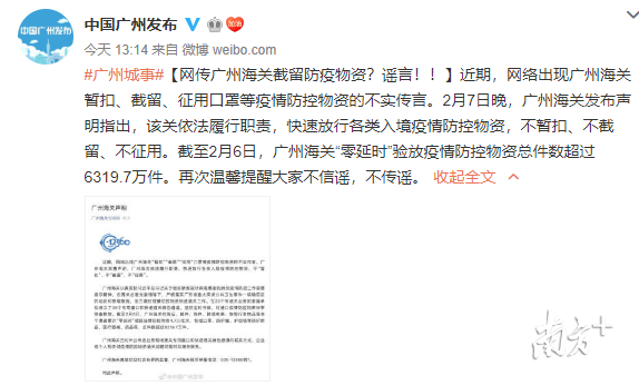 2月7日晚,廣州海關(guān)發(fā)布聲明稱,網(wǎng)絡(luò)“廣州海關(guān)暫扣、截留、征用口罩等疫情防控物資”為不實(shí)傳言。目前,廣州海關(guān)依法履行職責(zé),快速放行各類入境疫情防控物資,不暫扣、不截留、不征用。截至2月6日,廣州海關(guān)“零延時(shí)”驗(yàn)放疫情防控物資總件數(shù)超過6319.7萬件。上海、天津、寧波、大連、鄭州等地海關(guān)也紛紛辟謠,表示不會(huì)征用個(gè)人口罩。