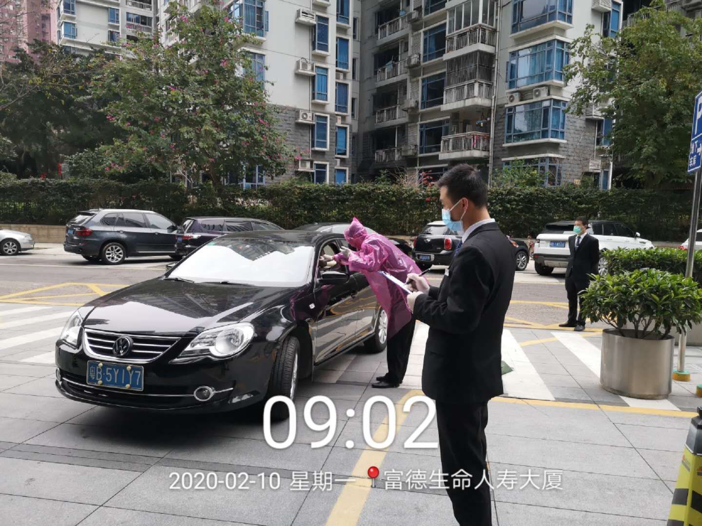 蓮花街道富德生命人壽大廈對(duì)進(jìn)入園區(qū)車輛駕駛員及乘客進(jìn)行體溫監(jiān)測(cè)及信息登記