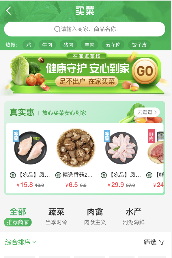 商品情況:店鋪相對較少,但果蔬肉禽海鮮齊全;另外,部分門店休息中,可先看看自己所在地區(qū)是否提供配送。
