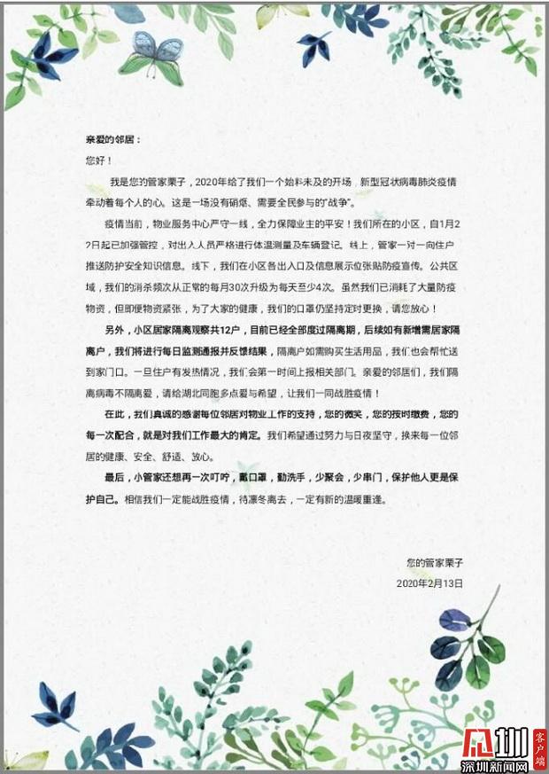 網(wǎng)友文婷婷向深圳新聞網(wǎng)記者透露,近日,位于龍華區(qū)的萊蒙水榭春天,有不少業(yè)主提出要給一線物業(yè)人員發(fā)放物資補(bǔ)貼,得到不少業(yè)主的認(rèn)可和支持。