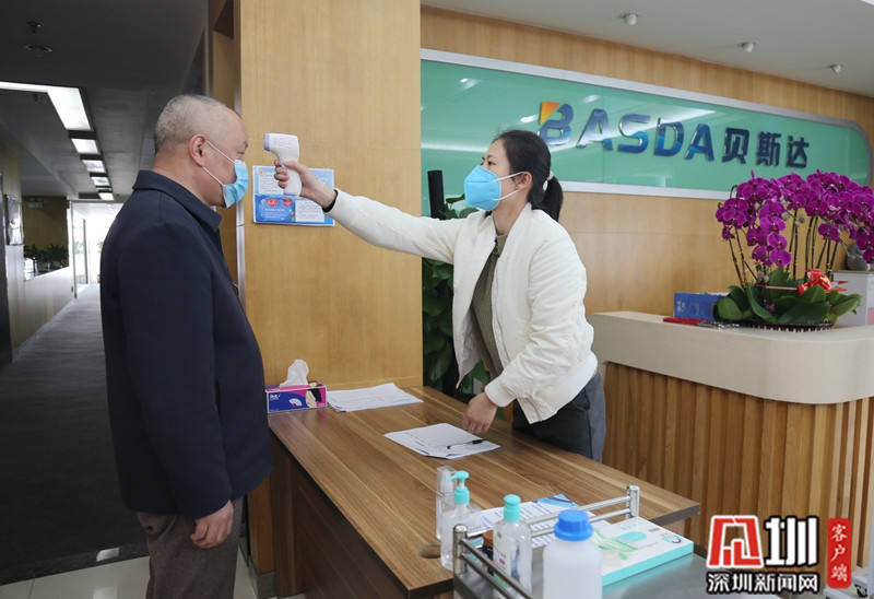 深圳貝斯達(dá)公司員工為進(jìn)出人員測量體溫。