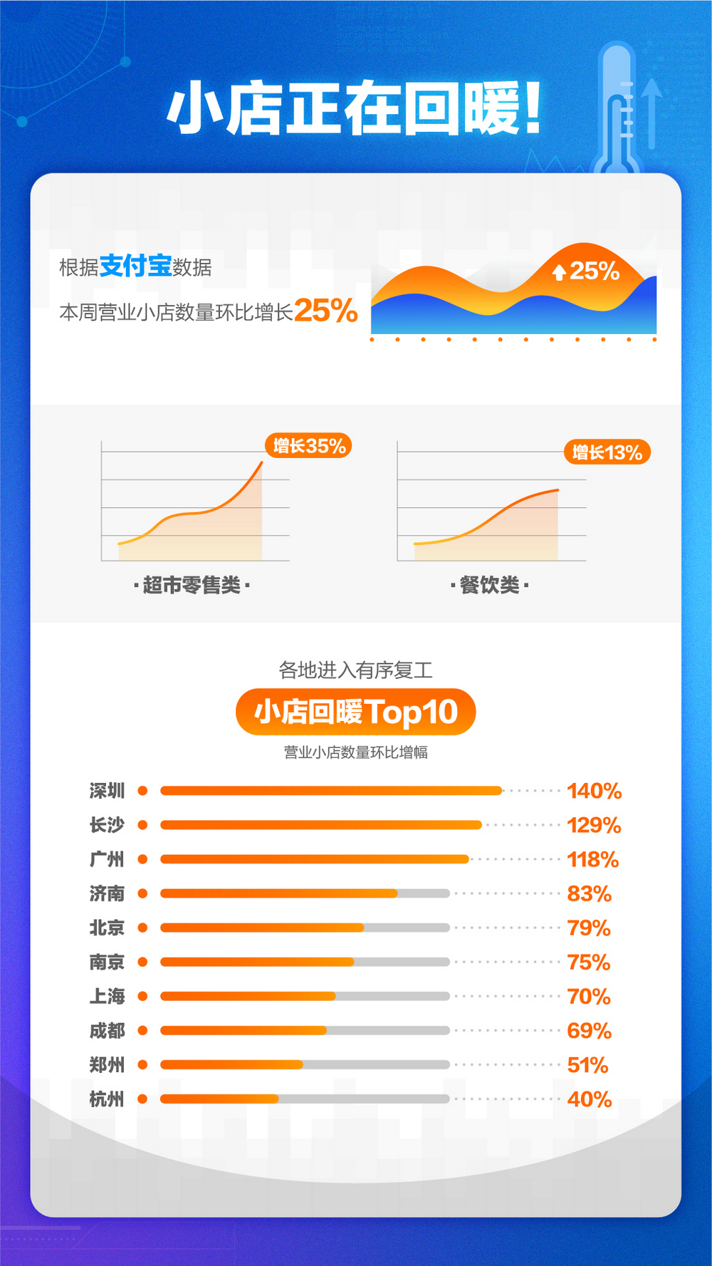 見圳客戶端·深圳新聞網(wǎng)2020年2月19日訊(見圳客戶端、深圳新聞網(wǎng)記者 陳婕)本周全國(guó)迎來新一輪復(fù)工潮,來自支付寶的最新數(shù)據(jù)顯示:本周營(yíng)業(yè)小店數(shù)量環(huán)比增長(zhǎng)25%,與百姓生活關(guān)聯(lián)度緊密的超市零售類小店,增幅達(dá)到35%。其中,深圳、長(zhǎng)沙、廣州的增幅最大,位列前三。