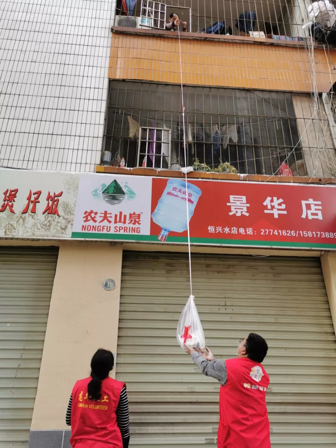 “為了實現(xiàn)無接觸配送,每天阿姨會把繩索放下來,她會電話告訴我們需要的菜品和生活用品,我們把她需要的東西都‘送’上去”。趙發(fā)威日常除了服務(wù)社區(qū)弱勢群體購買生活必需品,還承擔(dān)機(jī)動崗為需要替崗的志愿者“愛心接力”、執(zhí)行社區(qū)抗疫檢測點(diǎn)的測溫登記工作。
