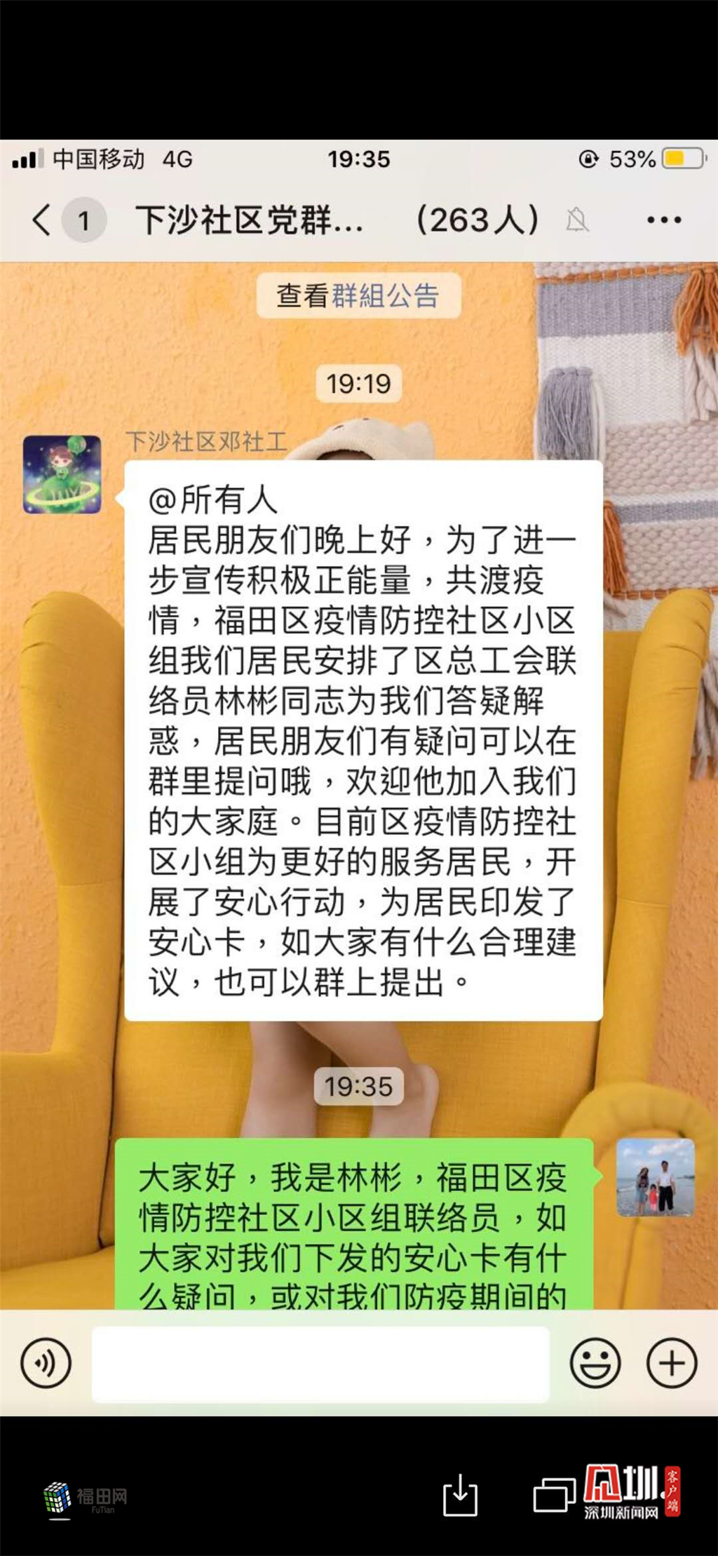 針對居民最關(guān)心自己居住的小區(qū)是否有確診病例、有無疑似病例、有無居家隔離人員的困惑,特別是出現(xiàn)了確診病例小區(qū)的居民更迫切想了解本小區(qū)采取了哪些防疫措施保證居民安全。福田區(qū)安心行動(dòng)第一條就是實(shí)施小區(qū)(村)疫情防控每日一播報(bào)機(jī)制,每個(gè)重點(diǎn)小區(qū),工作組安排一名處級干部和一名科級干部化身安心聯(lián)絡(luò)員,進(jìn)到小區(qū)業(yè)主群,督促配合小區(qū)物業(yè)管理處按指定模板公告今日疫情防控播報(bào),保障居民知情權(quán),同時(shí)聽取收集居民對防疫的意見建議,協(xié)調(diào)聯(lián)系解決,并反饋落實(shí)結(jié)果,對不能馬上解決的做好解釋說明。