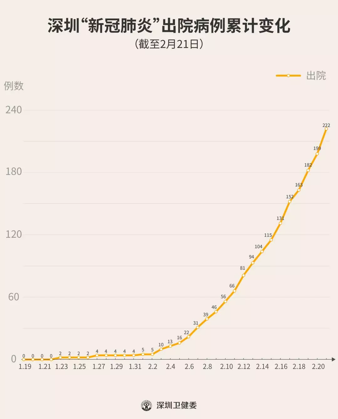 至此,深圳確診人數(shù)416人,出院人數(shù)222人,在院人數(shù)192人,出院總?cè)藬?shù)已超過確診總?cè)藬?shù)的一半。
