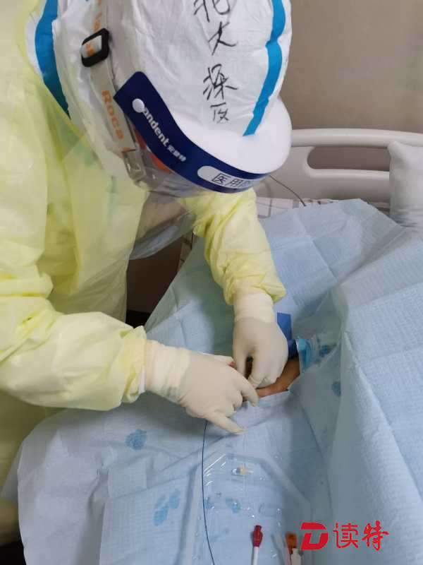 深圳醫(yī)療隊(duì)臨時(shí)黨支部書(shū)記王玲在監(jiān)利縣中醫(yī)院重癥病房為患者植入PICC導(dǎo)管。