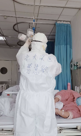 深圳醫(yī)療隊(duì)隊(duì)員曹慧敏在為患者服務(wù)。為了方便在“艙室”內(nèi)互相辨識(shí),醫(yī)護(hù)人員都在自己的衣服上用記號(hào)筆寫(xiě)上了名字。