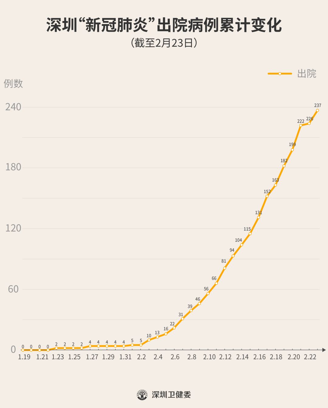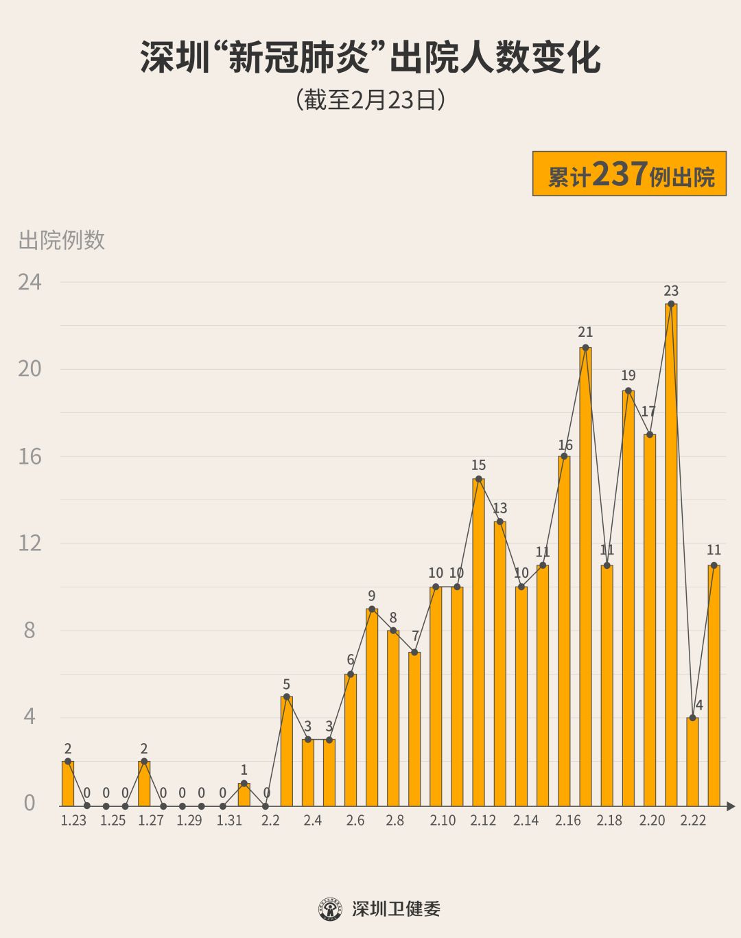2月23日下午,經(jīng)專家組會(huì)診,深圳有11名新型冠狀病毒肺炎確診患者出院,累計(jì)達(dá)237人,連續(xù)21天有人出院。