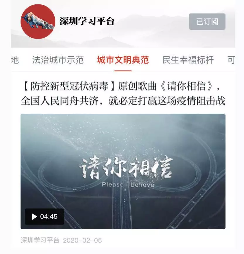 在深圳市委宣傳部的統(tǒng)一部署下,深圳的創(chuàng)作者們?cè)诙虝r(shí)間內(nèi)創(chuàng)作出眾多暖人心、聚力量的作品,《請(qǐng)你相信》是首批推出的作品之一。2月5日,《原創(chuàng)歌曲<請(qǐng)你相信>,全國(guó)人民同舟共濟(jì),就必定打贏這場(chǎng)疫情阻擊戰(zhàn)》視頻登上“學(xué)習(xí)強(qiáng)國(guó)”全國(guó)平臺(tái)“推薦”欄目,在朋友圈廣為傳播,反響良好。