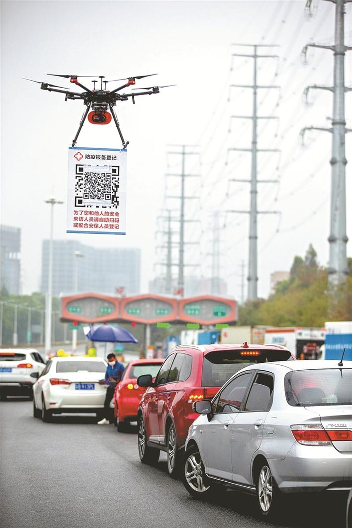 2月11日,在G94高速深圳觀瀾收費(fèi)處,深圳龍華機(jī)訓(xùn)大隊(duì)無人機(jī)飛行隊(duì)的民警操作懸掛有申報(bào)二維碼的無人機(jī)在候檢的車輛間飛行。晶報(bào)記者賴?yán)鐢z