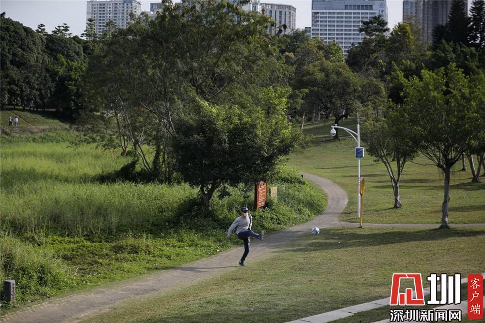 深圳中心公園,一位戴口罩踢足球的市民。