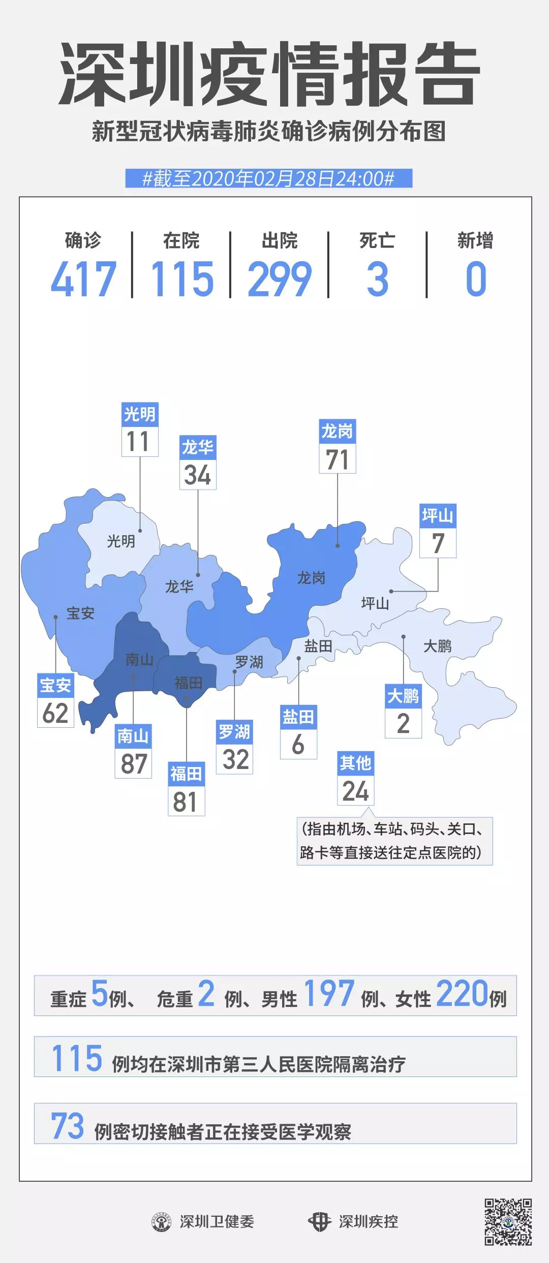 截至2月28日24時,深圳累計報告“新冠肺炎”確診病例417例。2月28日當(dāng)天全市無新增確診病例,當(dāng)天出院病例18例(從26日起不再公布出院個案)。