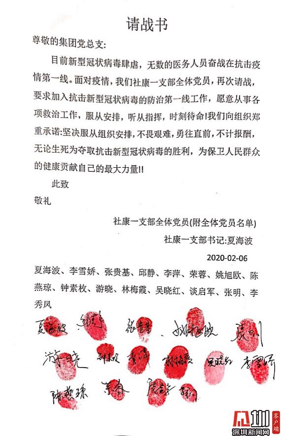 見圳客戶端·深圳新聞網訊(記者 董非)“讓黨旗在防控斗爭第一線高高飄揚?!毙鹿诜窝滓咔榘l(fā)生以來,南山區(qū)醫(yī)療集團總部黨員勇當先鋒,以實際行動踐行初心使命,涌現出眾多感人故事,展現了共產黨員的風采與擔當。 疫情發(fā)生后,南山區(qū)第一時間制定出臺了《黨建引領疫情防控工作五項行動方案》,南山區(qū)委書記王強號召全體黨員,發(fā)揮黨組織的戰(zhàn)斗堡壘作用和黨員的先鋒模范作用,全力保障人民群眾生命安全和身體健康,讓黨旗在防控疫情斗爭第一線高高飄揚,堅決打贏疫情防控人民戰(zhàn)爭、總體戰(zhàn)、阻擊戰(zhàn)。南山區(qū)醫(yī)療集團總部積極響應,黨建引領下的防控抗疫工作有序科學地展開。 今年1月底,深圳市南山區(qū)區(qū)委授旗成立南山醫(yī)療系統黨員突擊隊。南山區(qū)醫(yī)療集團總部緊急組建了防控新冠肺炎應急突擊隊,僅一天內區(qū)醫(yī)療集團就共有169人完成第一批應急突擊隊報名,其中黨員過半數。 疾風知勁草,烈火煉真金。一封封請戰(zhàn)書閃電匯聚到黨總支,召即來,來能戰(zhàn),戰(zhàn)能勝,沖鋒在前就是擔當的最美演繹;一位位黨員迅速入隊黨員突擊隊,他們重溫入黨誓言,在黨旗下實踐著醫(yī)者仁心、人間大愛;一份份入黨申請書紛沓而來,特殊時期經受特殊考驗,一批優(yōu)秀的醫(yī)護人員頁主動向黨組織靠攏。鏗鏘的語言、堅定的決心、舍我的擔當,是南山區(qū)醫(yī)療集團總部廣大黨員逆行而上、抗擊疫情的堅定決心和必勝信心。 最美逆行黨支部,積極請戰(zhàn)敢擔當 “我是共產黨員,我請戰(zhàn)!愿為戰(zhàn)勝疫情全力以赴!”這是南山區(qū)醫(yī)療集團總部一支部13名黨員和2名入黨積極分子聯名撰寫的《請戰(zhàn)書》(節(jié)選)。 面對新冠肺炎疫情,一支部黨員在夏海波支部書記夏海波的帶領下,在發(fā)熱門診、發(fā)熱患者預檢分診、社區(qū)“三位一體”排查等工作中,積極發(fā)揮共產黨員戰(zhàn)斗在一線、沖鋒在一線的模范帶頭作用,為戰(zhàn)勝新冠肺炎疫情全體黨員積極主動請戰(zhàn),并向集團黨總支遞交了請戰(zhàn)書。 社康一支部全體黨員的請戰(zhàn)書 一個個紅手印,令人淚目,彰顯著南山區(qū)醫(yī)療集團總部白衣天使們逆行而上的使命擔當和責任意識。 一支部書記夏海波說,“成為疫情防控工作第一線發(fā)展黨員,是面對疫情充分發(fā)揮黨員先鋒作用的具體實踐。此次請戰(zhàn),將更加激勵他們我們在今后的工作特別是近期防疫防控工作中,以黨員的標準嚴格要求自己,發(fā)揮黨員先鋒模范作用。同時,也會對全院全體員工產生積極引領、鼓舞作用,以更飽滿的斗志投入防疫防控工作。” 老黨員重溫入黨誓詞,面對黨旗表決心 “我宣誓:我志愿加入中國共產黨……”這是一次特別的宣誓。接到組織號召后,社康二支部的老黨員鐘達宏和吳麗娉,對著黨旗,以重溫入黨誓詞的方式,不忘黨員初心,牢記使命,積極沖鋒在前,誓要打贏防控狙擊戰(zhàn)。 社康二支部的老黨員鐘達宏和吳麗娉,對著黨旗,重溫入黨誓詞,誓要打贏防控狙擊戰(zhàn) 面對來勢洶洶的疫情,南山區(qū)醫(yī)療集團總部的黨組織和黨員干部不但沒有被嚇倒,反而激起了他們昂揚的戰(zhàn)斗意志和飽滿的工作熱情。 “我宣誓,我自愿加入抗擊新型冠狀病毒肺炎疫情防控工作隊伍,責任上肩,聽黨指揮,服從命令,科學應對,恪盡職守,努力守護轄區(qū)居民健康,堅決打贏疫情防控攻堅戰(zhàn)!”守土有責、守土擔責、守土盡責,所有社康中心的黨員干部將筑牢抗疫的基層防線,誓要守護轄區(qū)居民的生命健康。 社康二支部黨員在黨旗下宣誓努力守護轄區(qū)居民健康 艱難時刻主動請戰(zhàn),夫妻雙雙奮戰(zhàn)一線 1月26日,南山區(qū)醫(yī)療集團總部下發(fā)關于組建防控新型冠狀病毒感染肺炎應急突擊隊報名的通知。除了得到集團黨員們的積極響應之外,各個支部涌現出一波遞交入黨申請書的小高潮。 李婧是社康支部的一名全科醫(yī)生,一直在社康醫(yī)院中心從事全科醫(yī)療工作,戰(zhàn)“疫”的號角吹響,李婧第一時間參戰(zhàn),在所有抗疫時期入黨人員里第一個遞交了手寫入黨申請書。 李婧醫(yī)生的手寫入黨申請書 起初,她所在的蔚藍海岸社康中心考慮到李婧的愛人是深圳市公立醫(yī)院急診科醫(yī)生其愛人是深圳市某公立醫(yī)院的急診科醫(yī)生,疫情發(fā)生以來一直堅守在崗位上,家中尚有1歲零3個月的寶寶,就沒有讓她參加社區(qū)“三位一體”排查和酒店留守值班等一線工作和醫(yī)學觀察點留守值班等一線工作。李婧得知后,她主動提交請戰(zhàn)書、舍小家顧大家,并沒有因為生活上的困難而有所退縮,主動要求參與疫情排查一線工作。李婧夫妻還制定了家庭的“交接班”制度,一個去上白班,另一個就上夜班。 執(zhí)行三位一體排查工作前,李婧醫(yī)生與民警、社區(qū)工作者開會準備 在南山醫(yī)療集團第六黨支部書記蔡偉山給她的入黨介紹信中這樣寫道:李婧和她的愛人都雙雙忙碌在疫情一線李婧和她的愛人都雙雙忙碌在疫情防控一線,她這種顧全大局的無私奉獻精神,這份執(zhí)著和堅定的職業(yè)信念,為我們社康醫(yī)務人員積極參與一線疫情工作樹立了榜樣,也為我們社康更好的開展疫情工作注入了強大的動力和熱情。