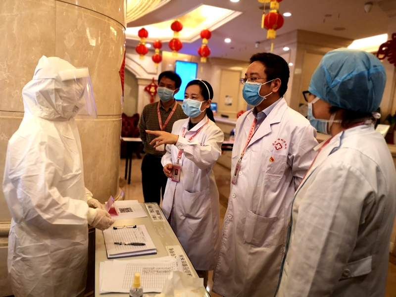 在街道辦、醫(yī)院、酒店、派出所等各部門的積極配合和協(xié)調(diào)下,僅僅41小時,一間停業(yè)的酒店順利啟動成為全區(qū)最大的健康驛站。為了更好的起到內(nèi)防擴散,外防輸入的作用,2月26日上午,福田區(qū)婦幼院、福田街道、福強派出所相關(guān)負責人帶隊到驛站模擬演練,進一步規(guī)范優(yōu)化流程管理。