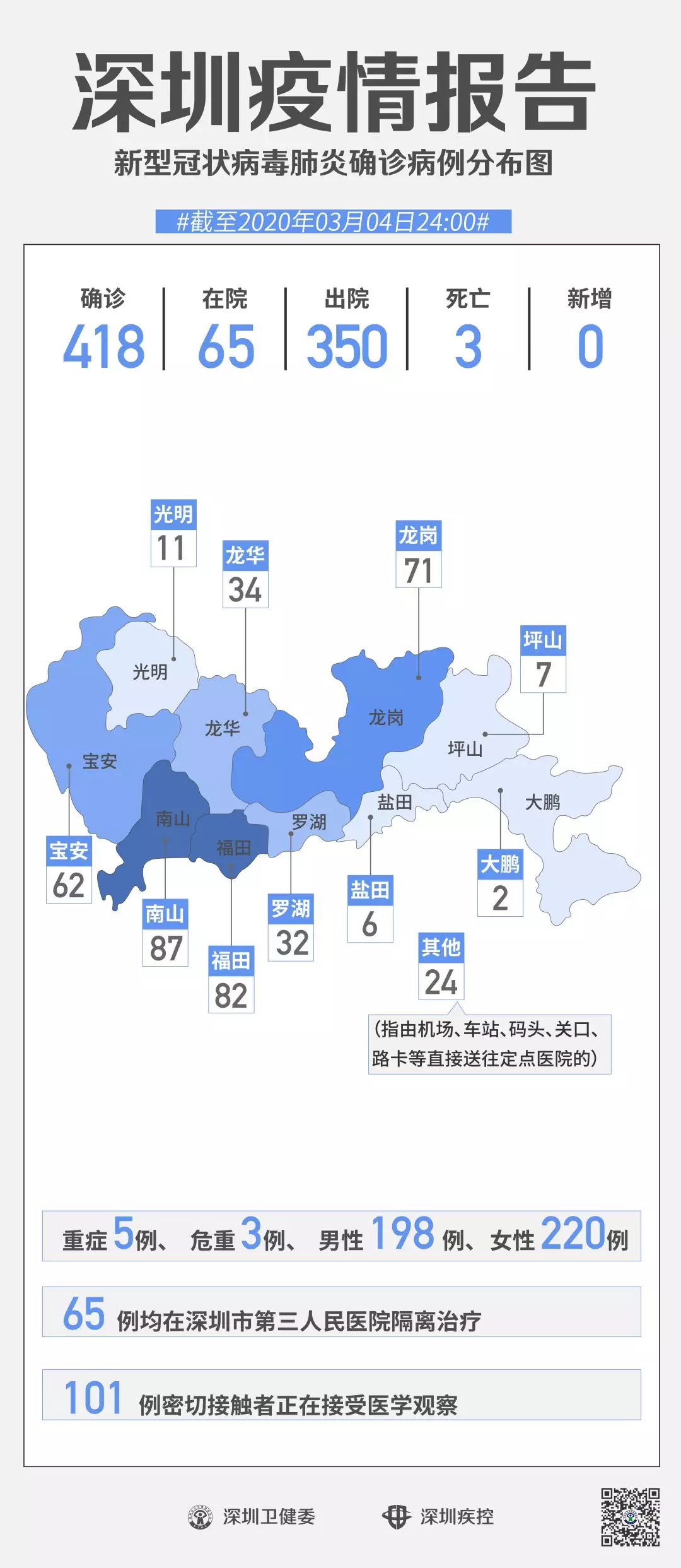 見圳客戶端·深圳新聞網(wǎng)2020年3月5日訊 截至3月4日24時,深圳累計報告“新冠肺炎”確診病例418例。3月4日當天全市無新增確診病例,當天出院病例9例(從2月26日起不再公布出院個案)。