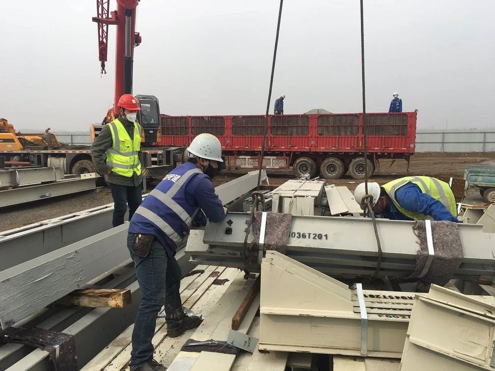 任丘能源生態(tài)園復(fù)工后首車鋼結(jié)構(gòu)到現(xiàn)場(chǎng),相關(guān)人員正在有序清點(diǎn)、卸車、堆放,為下一步安裝工程夯實(shí)基礎(chǔ)。