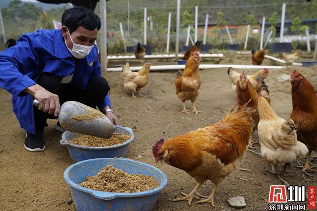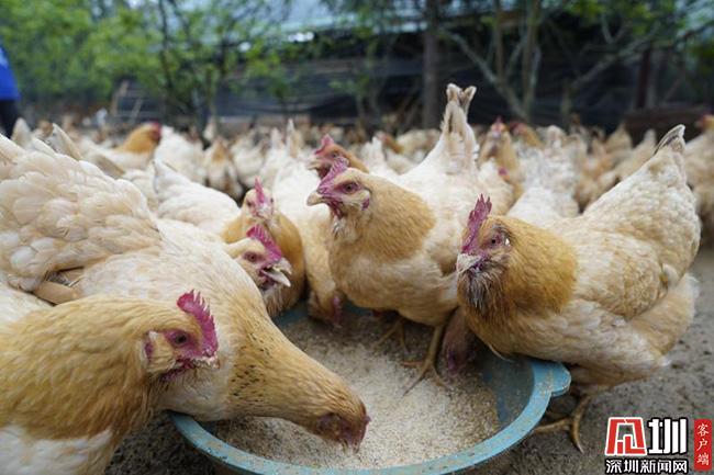 3月11日的清晨,66歲的王子平頂著薄霧,在田西村百香雞孵化養(yǎng)殖基地中,撒下了喂養(yǎng)雞群的百香果玉米等混合飼料。這些雞,已經(jīng)在田西村山坡上散養(yǎng)了超過240天,也就是扶貧產(chǎn)業(yè)農(nóng)產(chǎn)品“百香雞”。這是深圳南山對(duì)口扶貧連平縣百香雞孵化養(yǎng)殖基地的一個(gè)勞作場(chǎng)景。