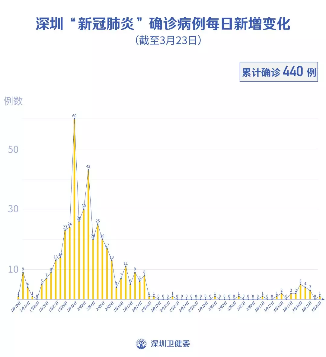 截至3月23日24時,深圳累計報告“新冠肺炎”病例440例。3月23日當天新增1例,出院1例。