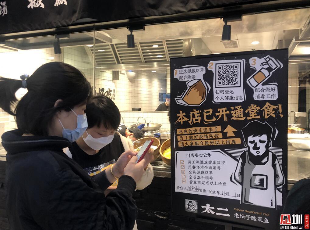 在太二酸菜魚門口,多位市民正按照員工要求,排隊(duì)掃碼登記個人健康信息。太二酸菜魚工作人員表示,門店嚴(yán)格按照要求,做好員工和消費(fèi)者體溫檢測、健康監(jiān)控和佩戴口罩洗手消毒等防疫防控工作。