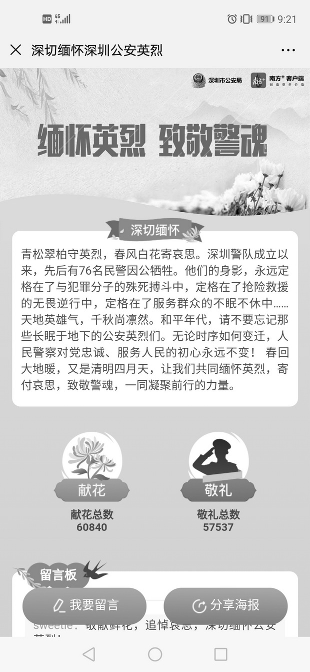 據(jù)介紹,鑒于當(dāng)前疫情防控形勢(shì),市公安局不組織集體祭掃活動(dòng),通過公安內(nèi)網(wǎng)、互聯(lián)網(wǎng)等網(wǎng)絡(luò)開設(shè)“緬懷英烈”專欄開展“網(wǎng)上祭掃”活動(dòng),市民群眾可點(diǎn)擊深圳公安微信公眾號(hào),向公安英烈獻(xiàn)花、留言,寄托哀思,致敬警魂。