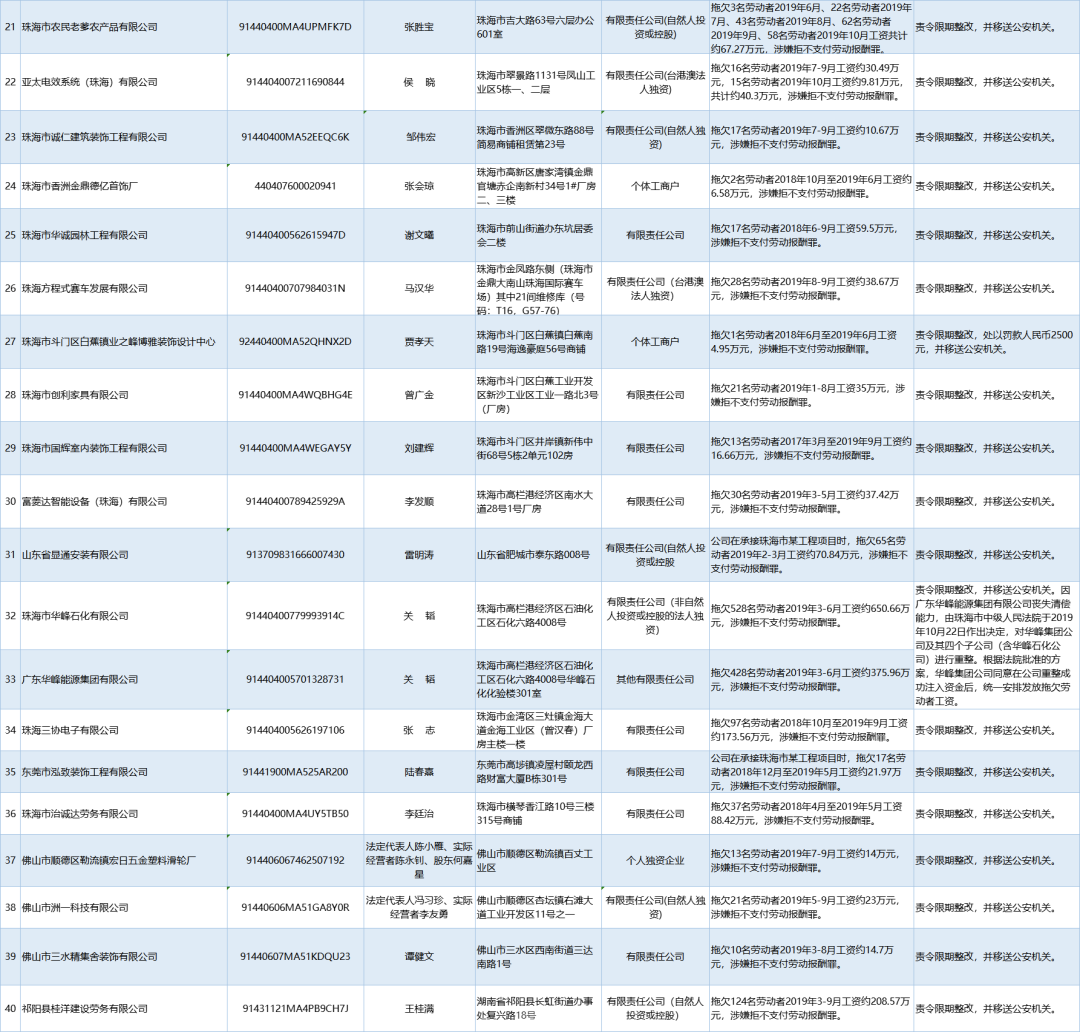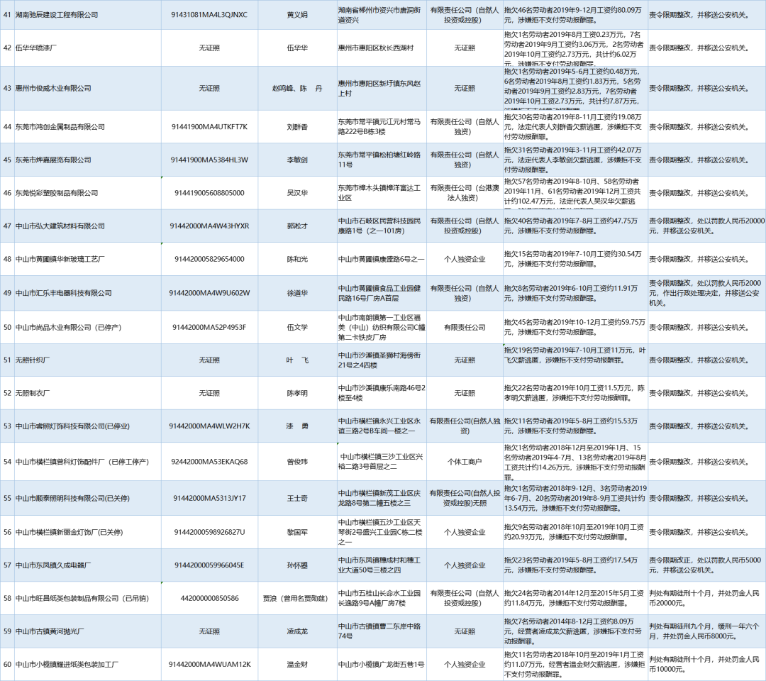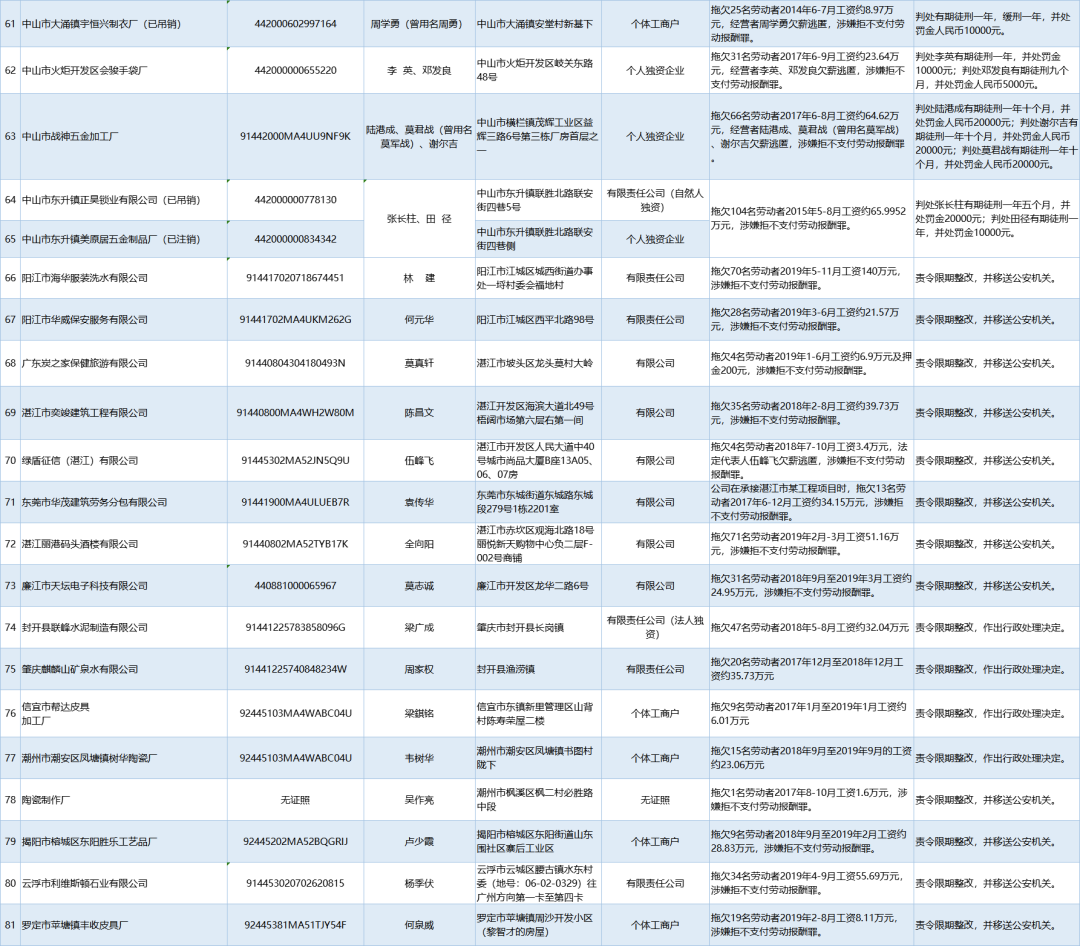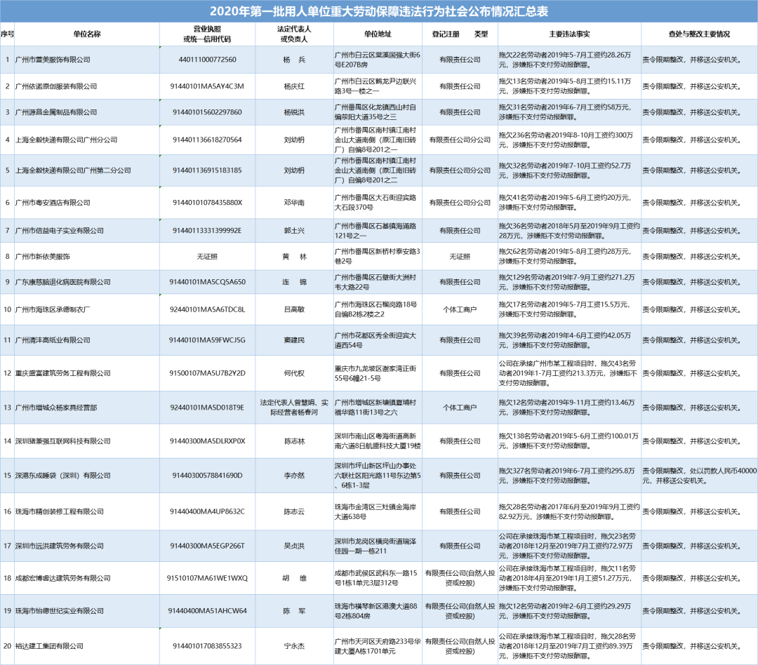 為加強對違法用人單位的社會監(jiān)督,強化誠信體系建設,加大威懾力,依據《廣東省用人單位重大勞動保障違法行為社會公布暫行規(guī)定》,省人社廳公布2020年第一批重大違法案件,涉及81家企業(yè),其中深圳豬兼強互聯(lián)網科技有限公司拖欠138名勞動者2019年5-6月工資約100.01萬元,涉嫌拒不支付勞動報酬罪,被責令限期整改,并移送公安機關。深港東成睡袋(深圳)有限公司拖欠327名勞動者2019年6-7月工資約295.8萬元,涉嫌拒不支付勞動報酬罪,被責令限期整改,處以罰款人民幣4萬元,并移送公安機關。