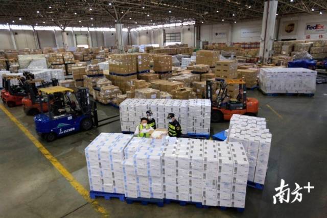 深圳海關保障深圳向國際友好城市捐贈的抗擊疫情物資順暢通關。圖為海關人員正在檢查貨場防疫物資。南方日報記者朱洪波攝