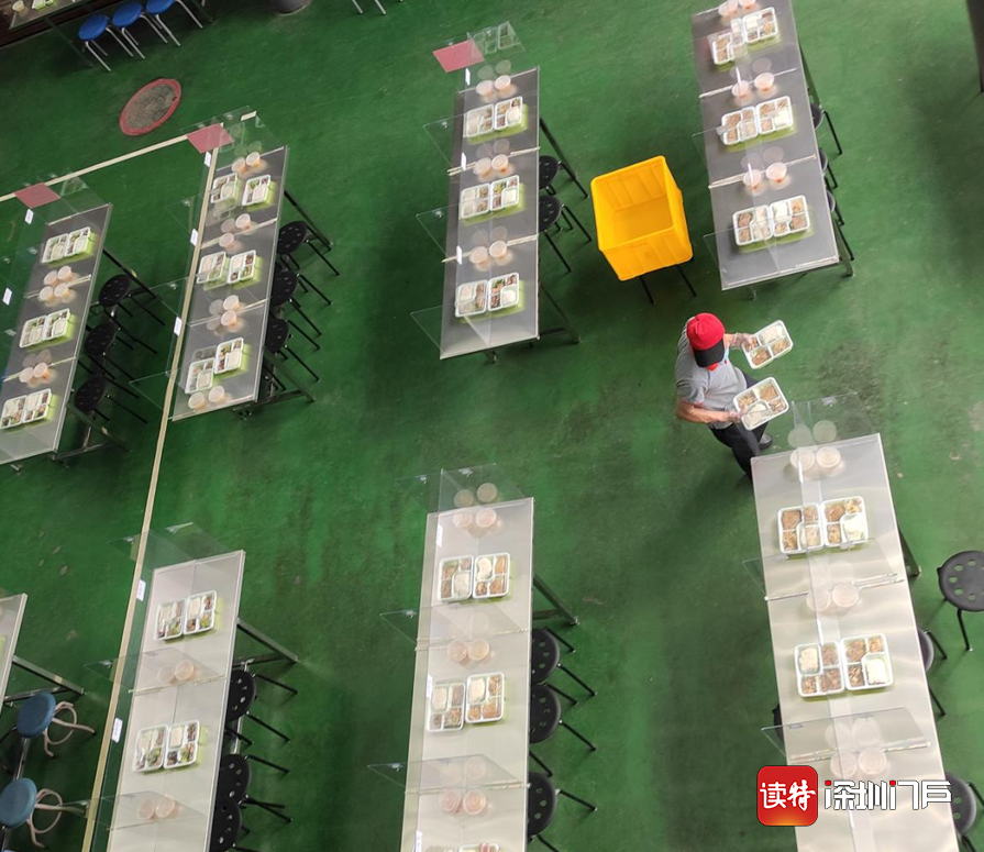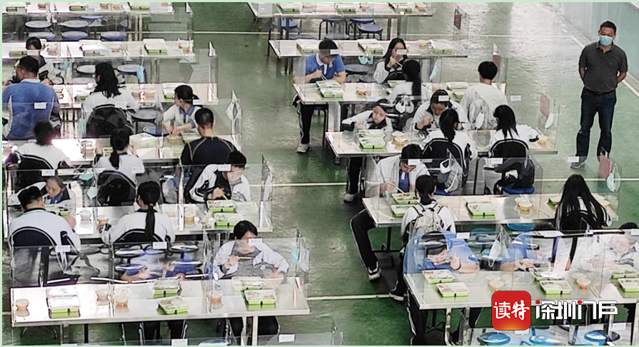 梅林中學的學生分批開始了午餐。在用餐前,餐廳服務人員將飯盒一一放在桌子上。學生坐下后可直接用餐,不得交談,桌子中間設置了隔擋。