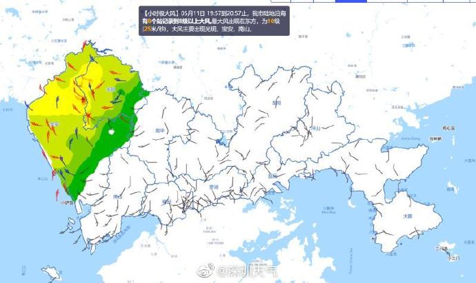 22時(shí)18分:過(guò)去1小時(shí)深圳市最大陣風(fēng)達(dá)到10-11級(jí),出現(xiàn)在鹽田和大鵬南澳地區(qū)。
