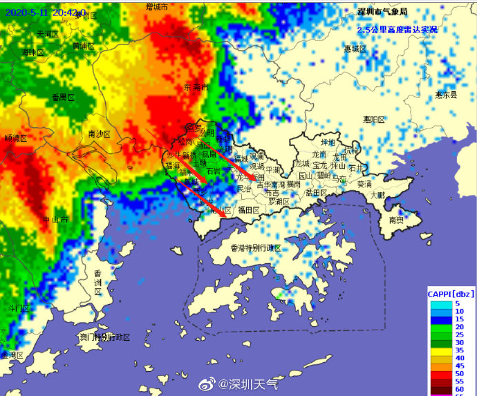 20時(shí)56分:目前強(qiáng)雷雨云團(tuán)已開(kāi)始影響寶安北部,未來(lái)一小時(shí)強(qiáng)雷雨自西向東影響寶安、光明、龍華、南山、福田、羅湖區(qū),上述區(qū)域最大小時(shí)雨量30-40毫米,請(qǐng)大家注意做好防御。
