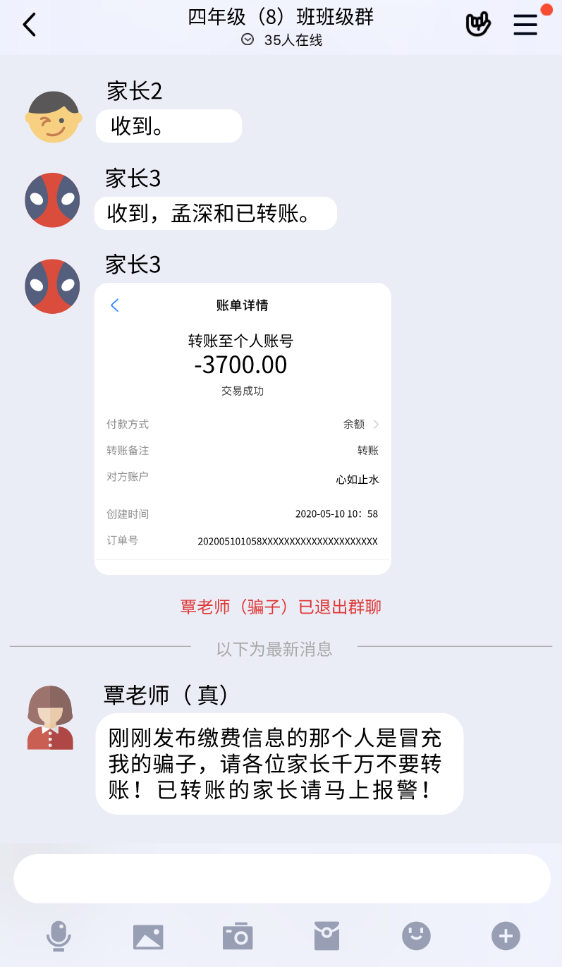 騙子在收款后立即退群,等真老師上線后,被騙父母醒悟過來后,騙子已經(jīng)逃之夭夭。