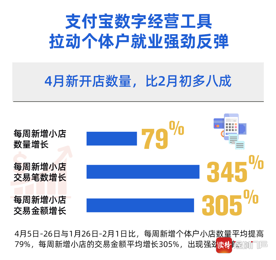 北京大學(xué)數(shù)字金融研究中心通過(guò)分析支付寶最新數(shù)據(jù)發(fā)現(xiàn),與疫情中最低點(diǎn)相比,全國(guó)個(gè)體戶就業(yè)形勢(shì)已出現(xiàn)強(qiáng)勁反彈:隨著復(fù)工復(fù)產(chǎn)的全面推進(jìn)和消費(fèi)券的發(fā)放,4月以來(lái)與疫情最低點(diǎn)2月1日當(dāng)周相比,每周新增個(gè)體戶小店數(shù)量平均提高79%,每周新增小店的交易金額平均增長(zhǎng)305%。