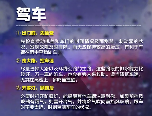 √雨天路滑,注意車輛行駛安全,控制車速防止追尾等事故的發(fā)生,繞開積水隧道涵洞和城市低洼區(qū)域,防止跌入窨井、地坑,不要在深水區(qū)逗留。