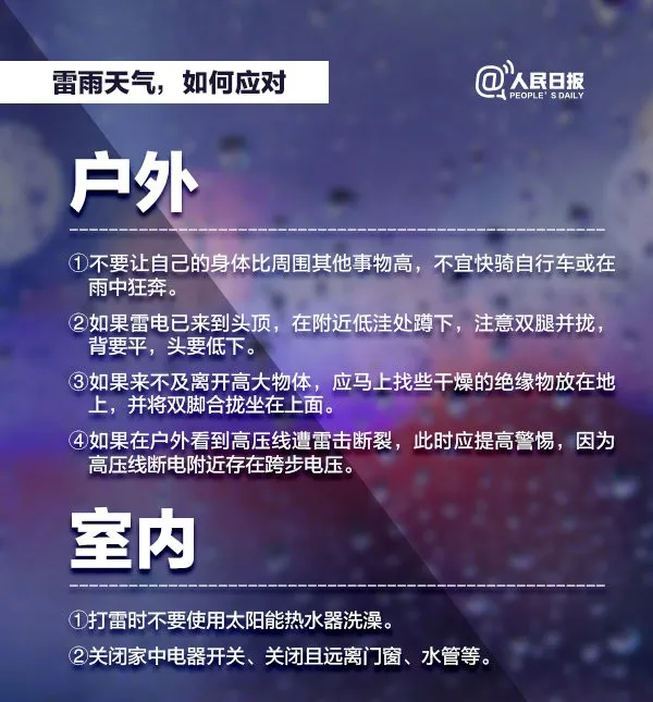 √雷雨天氣容易發(fā)生泥石流、山體滑坡,如在野外,請不要在室外逗留,盡快遠離危險的地方。