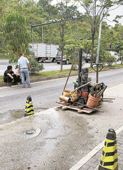 2020年5月1日,執(zhí)法支隊龍崗大隊執(zhí)法人員在轄區(qū)內(nèi)值班巡查時,接到投訴稱愛南路上海外國語學(xué)校門口有道路施工人員鉆探時鉆破水管,現(xiàn)場水流滿地,請求執(zhí)法人員前往調(diào)查。