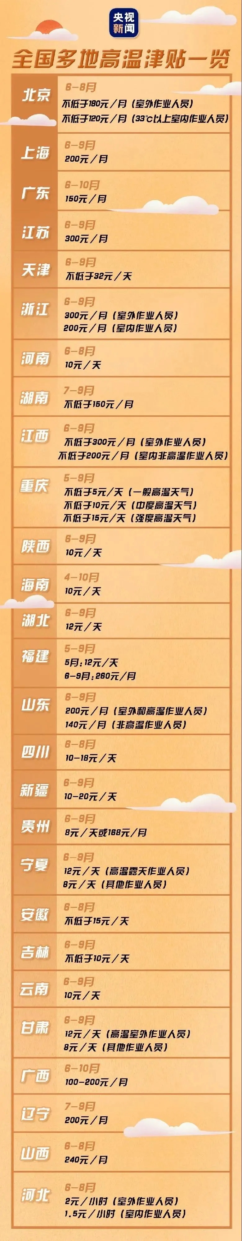 部分省份高溫津貼發(fā)放標準如下: