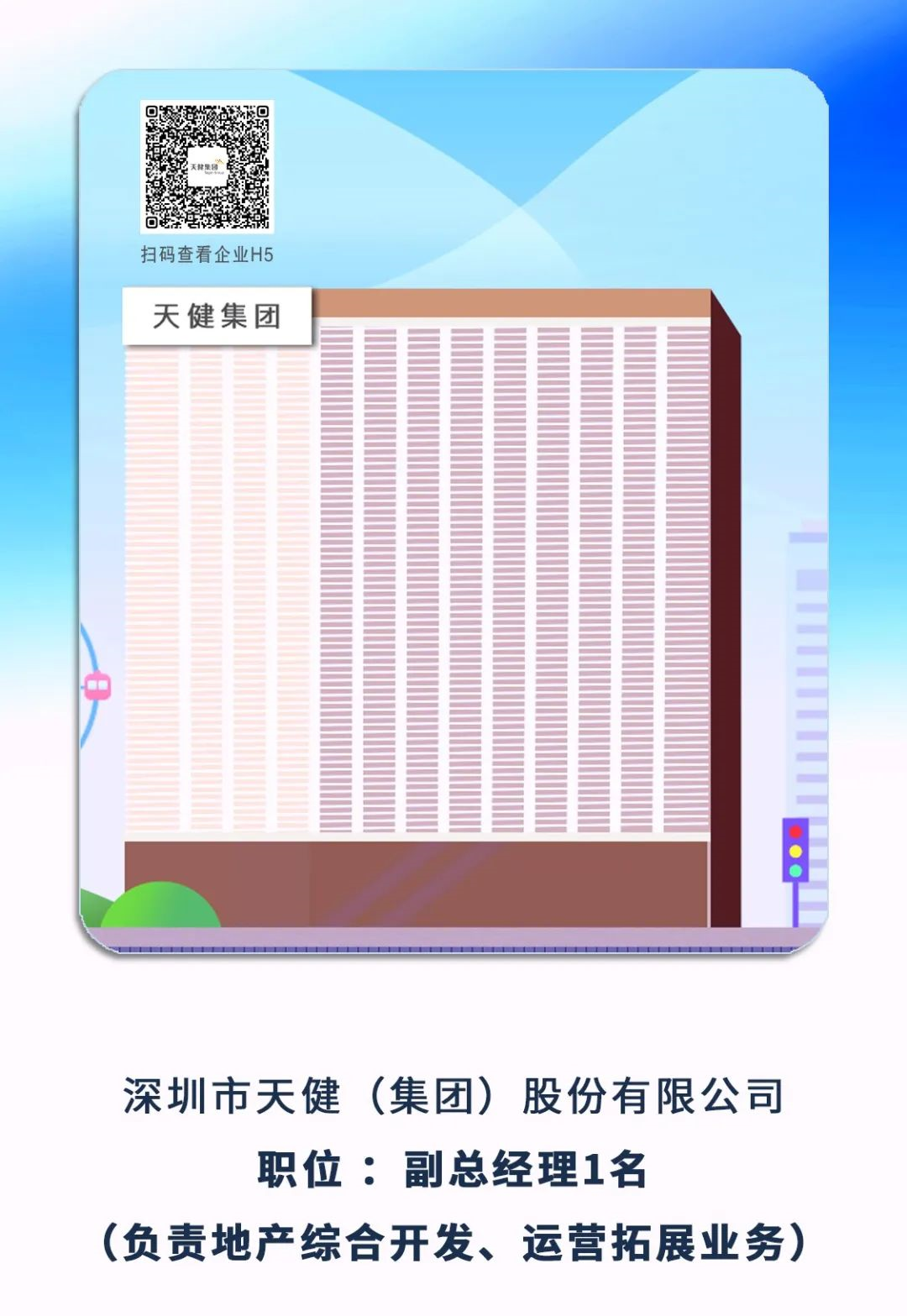 6、深圳市天?。瘓F(tuán))股份有限公司副總經(jīng)理1名(負(fù)責(zé)地產(chǎn)綜合開(kāi)發(fā)、運(yùn)營(yíng)拓展業(yè)務(wù))