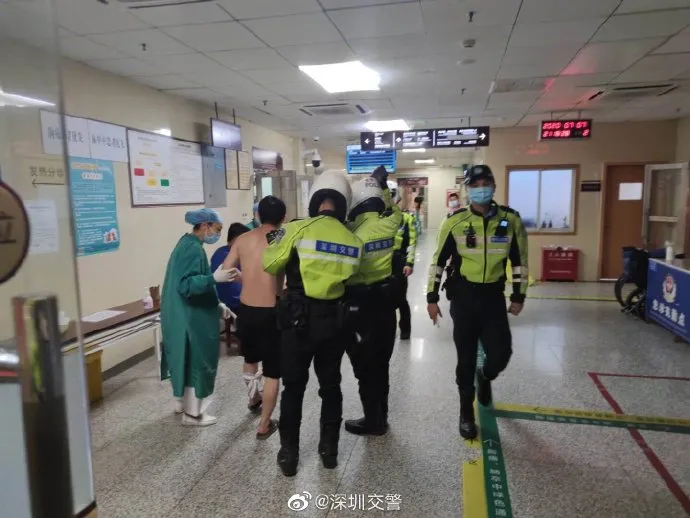 鐵騎一路沿著南坪快速往彩田路行駛,到達(dá)梅林關(guān)的位置后,跟福田交警匯合,采取前面開(kāi)路后方護(hù)送的方式,花了15分鐘,就將病患護(hù)送到了市中醫(yī)院急診科。