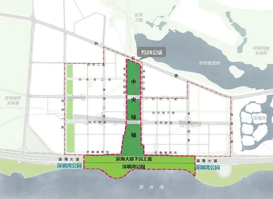 今年6月6日上午,該基地舉行中央綠軸項目開工活動,此次開工的中央綠軸項目南北全長約1.0公里,最大寬度達210米,是連接塘朗山——華僑城濕地——深圳灣“通山達海”的核心空間軸線。隨著濱海大道深超總段下沉工程建設(shè),未來深超總紅線內(nèi)景觀將與深圳灣公園無縫銜接,共同構(gòu)成南北貫通的中央綠軸體系。