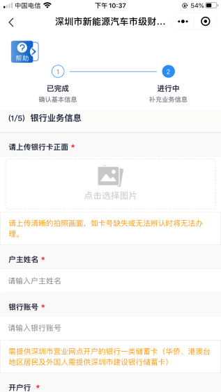 客戶需上傳銀行卡照片,并填寫銀行賬號、開戶行信息。開戶行如不在選項范圍內(nèi)可選擇“其他”自填。其中,銀行賬號需為深圳市營業(yè)網(wǎng)點開戶的銀行一類儲蓄卡,華僑、港澳臺地區(qū)居民及外國人需提供深圳市建設(shè)銀行一類儲蓄卡。