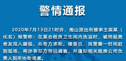 10、7月16日,南山警方發(fā)布對“女生合租房衛(wèi)生間洗浴被同租男舍友闖入”事件的警情通報,違法行為人陳某亮(男,31歲)行為已構(gòu)成侵犯他人隱私,南山警方已依法對陳某亮作出行政拘留5日的處罰決定。