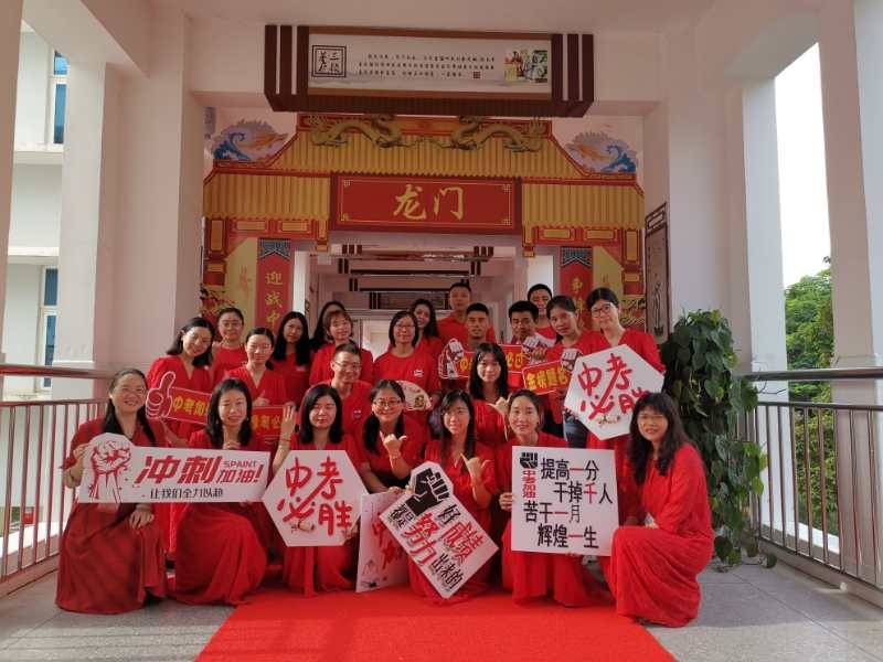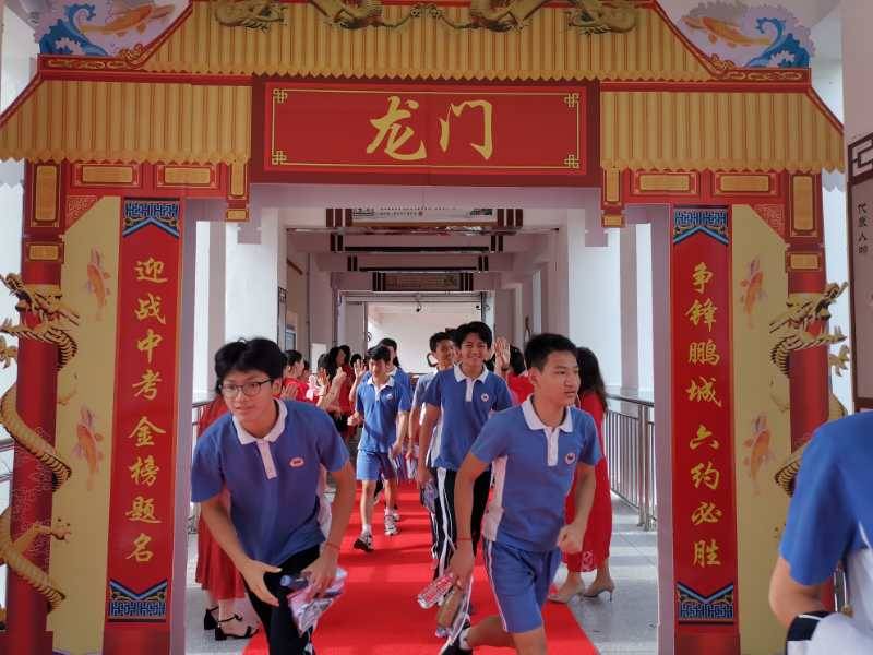 龍崗六約學(xué)校全體行政人員與九年級老師,穿著紅色送考服送考,寓意“鴻運(yùn)當(dāng)頭”。九年級學(xué)生走過龍門,踏上紅地毯,自帶炫酷出場bgm。(記者李麗